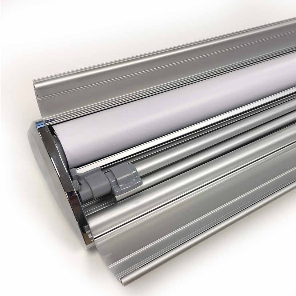 Le Roll-up Deluxe dispose d'un système de barre à clipser pour la fixation de la bâche dans le mécanisme. Cette barre s'ouvre et se referme très aisément pour vous faciliter le changement d'image. En quelques secondes et sans effort, vous pouvez renouveler votre message.