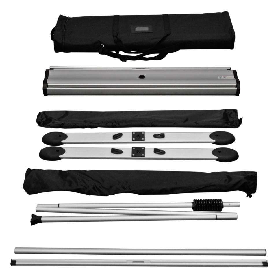 Chaque pack comprend : un caisson imprimé, deux larges pieds, quatre sardines, un montant vertical solide, deux profilés de maintien supérieur, une housse renforcée et une ou deux bâches imprimées quadri selon la configuration choisie.