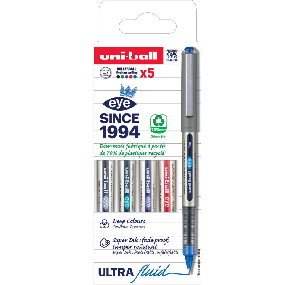 Le Uni-ball Eye Fine roller est un stylo à encre liquide pigmentée offrant une écriture précise avec une largeur de trait de 0,5 mm. Cet étui de 5 pièces en couleurs assorties (bleu, rouge, vert, violet et noir) est idéal pour tous vos besoins d'écriture quotidiens.