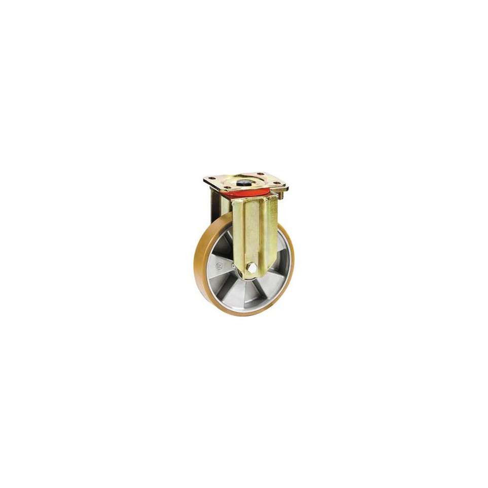 Roulette fixe en polyuréthane de diamètre 200 mm, conçue pour le transport de charges lourdes dans des environnements industriels. Sa monture robuste et sa roue résistante assurent fiabilité et fluidité lors des déplacements.