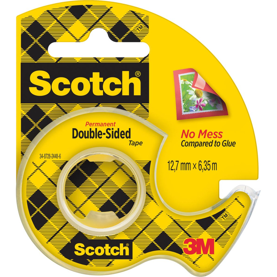 Ruban adhésif double face Scotch de 12,7 mm x 6,3 m, livré avec un distributeur et un rouleau. Idéal pour les projets de bureau, les loisirs créatifs ou la fixation discrète d’objets, il s’utilise notamment sur papier, photos et surfaces lisses.