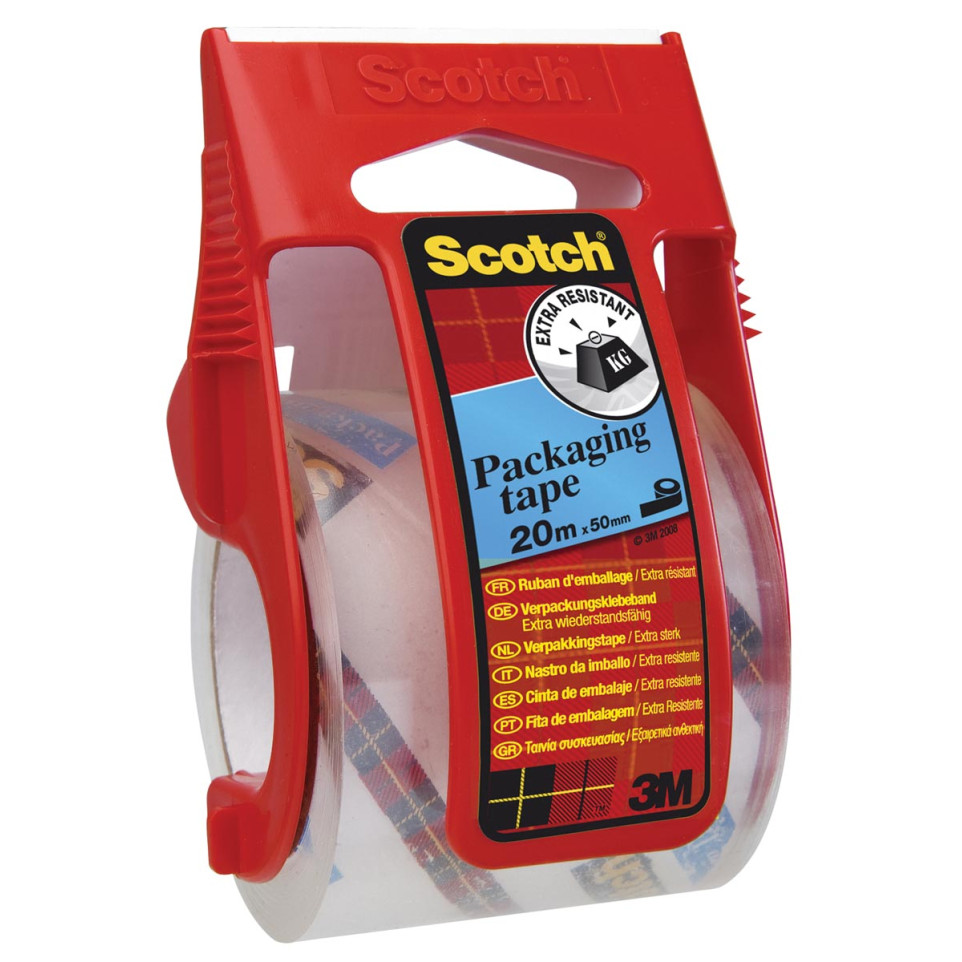 Dévidoir Scotch avec ruban adhésif d’emballage transparent, format 50 mm x 20 m, conçu pour sceller des colis de 5 à 10 kg. Idéal pour la fermeture rapide et propre de cartons ou enveloppes à la maison ou au bureau.