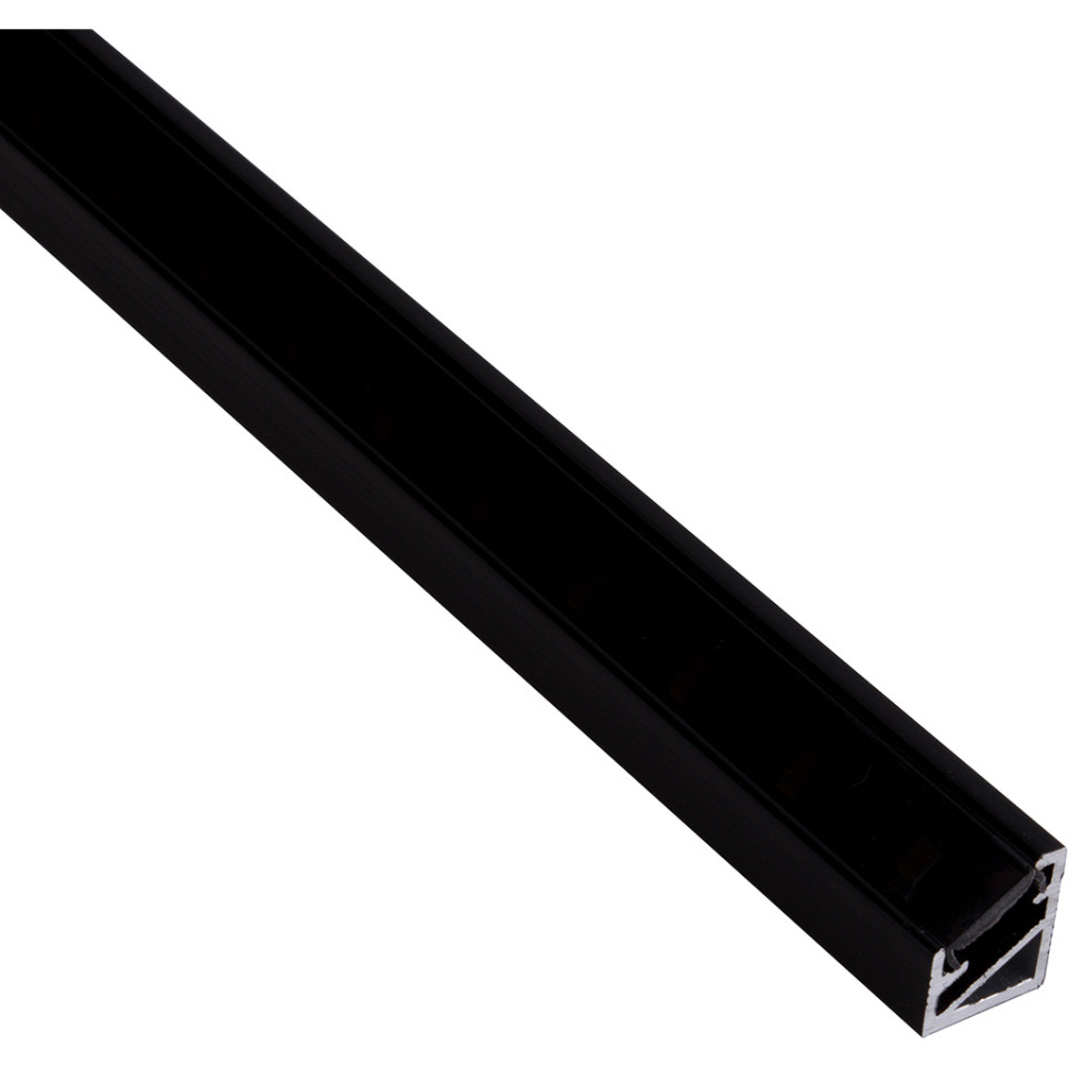 Profil Led appliquer Tri-Line mini 16x14x10mm en aluminium noir avec un couvercle noir, d’une longueur de 2 mètres. Conçu pour accueillir des rubans LED jusqu’à 10 mm de large, il s’intègre facilement dans des projets lumineux architecturaux ou décoratifs.