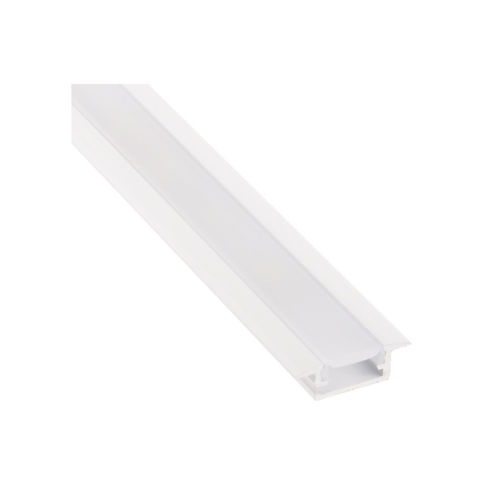 Profil LED encastré In-Line mini XL 14x6mm en aluminium blanc avec cover opal de 2 mètres, conçu pour une intégration discrète dans les meubles, les cloisons ou les surfaces décoratives. Idéal pour obtenir un éclairage linéaire moderne avec des rubans LED.