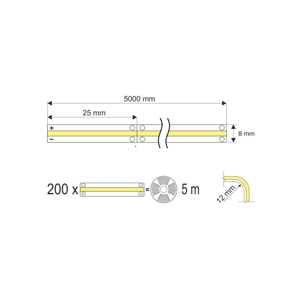 La bande LED COB Soft 5m x 8mm fonctionne en 12V et émet une lumière blanche froide à 6000K, avec une puissance de 6,4W/m et un flux lumineux de 700 lm/m, pour un rendu linéaire homogène.