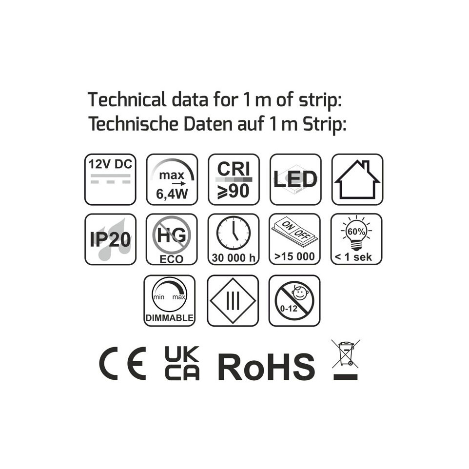 La bande est-elle utilisable en extérieur ? — Non. Avec un indice de protection IP20, cette bande est réservée à un usage en intérieur, dans des environnements secs et à l'abri de l'humidité.
