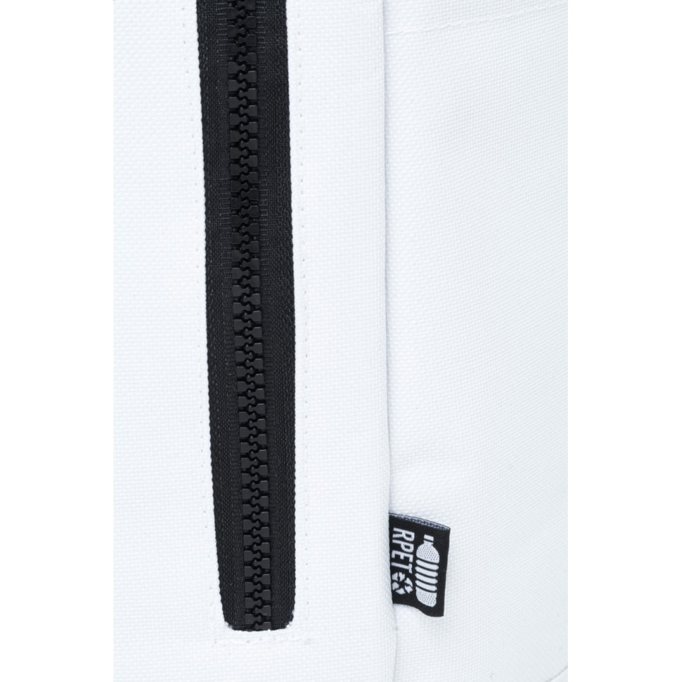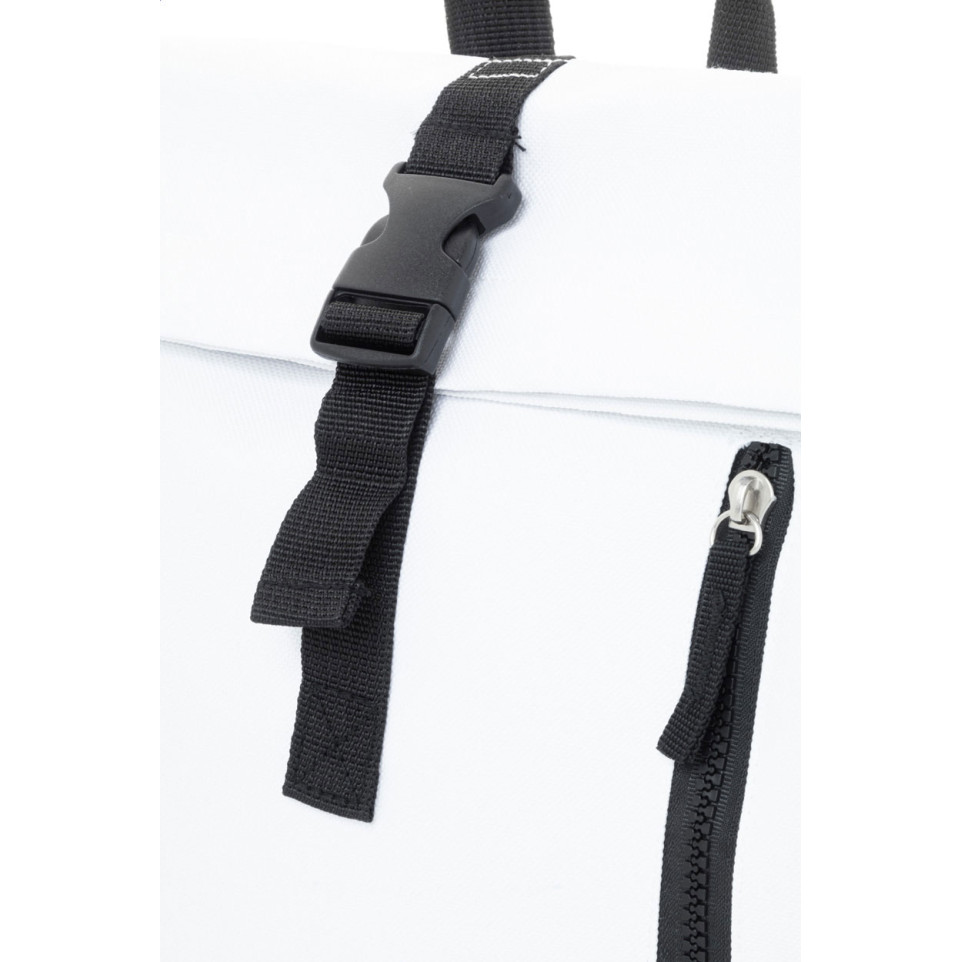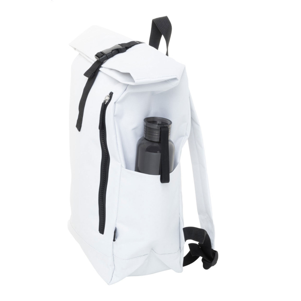 Sac à dos RPET rolltop Reback blanc, conçu avec un compartiment pour ordinateur portable 14" et une poche avant zippée. Idéal pour un usage quotidien professionnel ou étudiant, alliant fonctionnalité et engagement écologique.