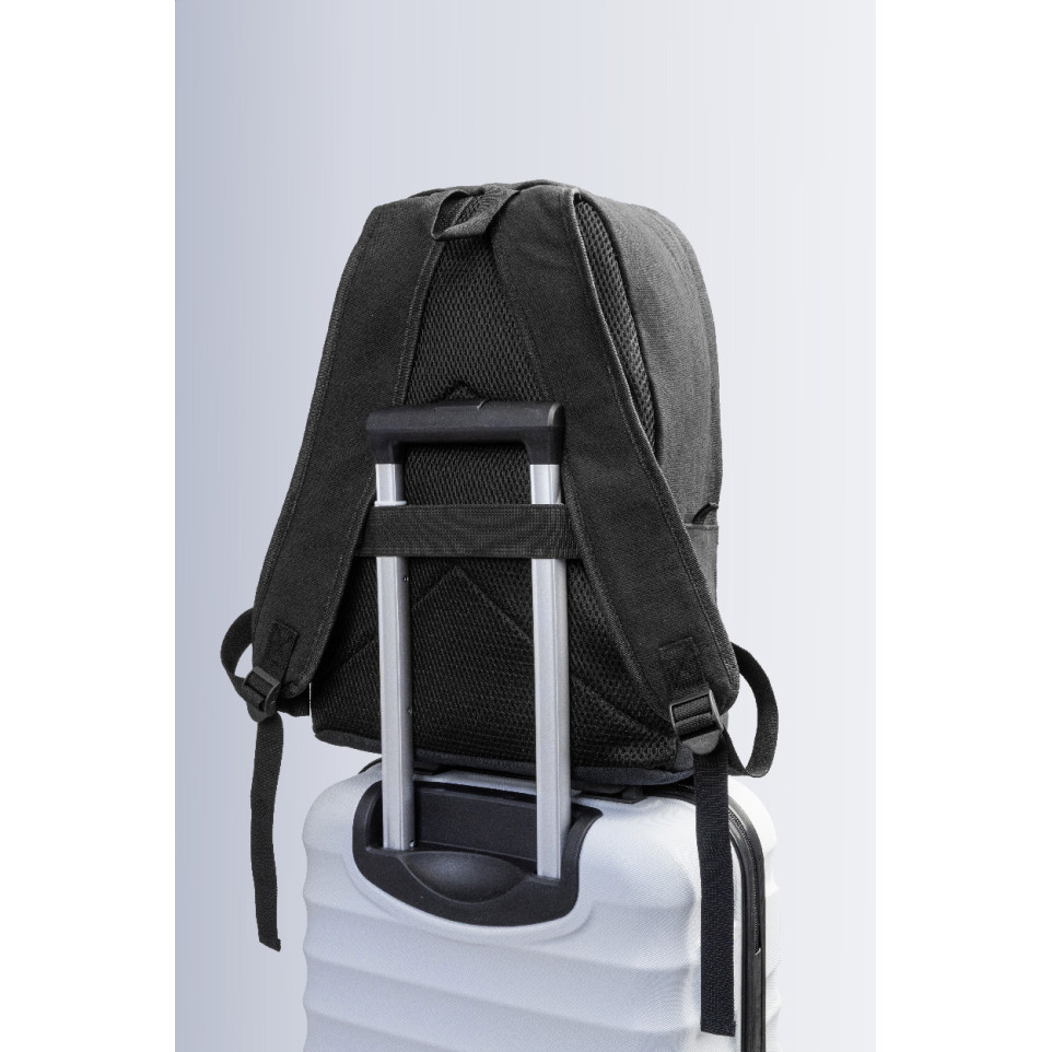 Sac à dos noir en canvas recyclé, fonctionnel et robuste, idéal pour transporter un ordinateur portable et vos essentiels au quotidien. Convient aux déplacements urbains, trajets professionnels ou activités scolaires.