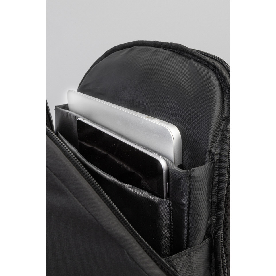Sac à dos antivol en polyester RPET recyclé, conçu pour transporter ordinateur portable et tablette au quotidien, alliant sécurité, confort et engagement environnemental.
