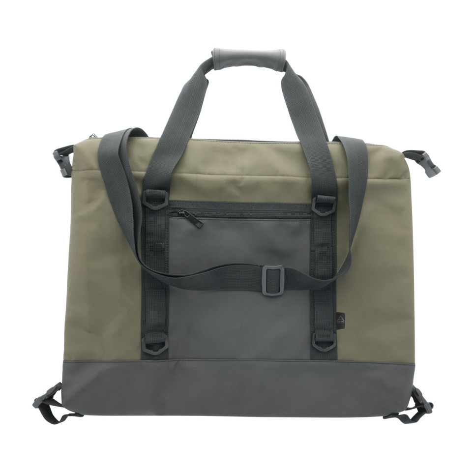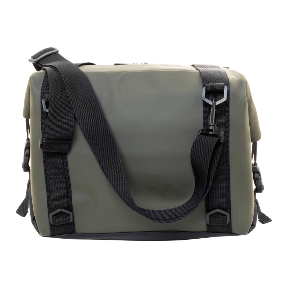 Sac isotherme pliable vert en PU recyclé, doté d’une fermeture zippée, d’un rembourrage aluminium et d’une poche avant zippée. Parfait pour conserver vos repas et boissons au frais lors de vos déplacements, pique-niques ou pauses déjeuner.