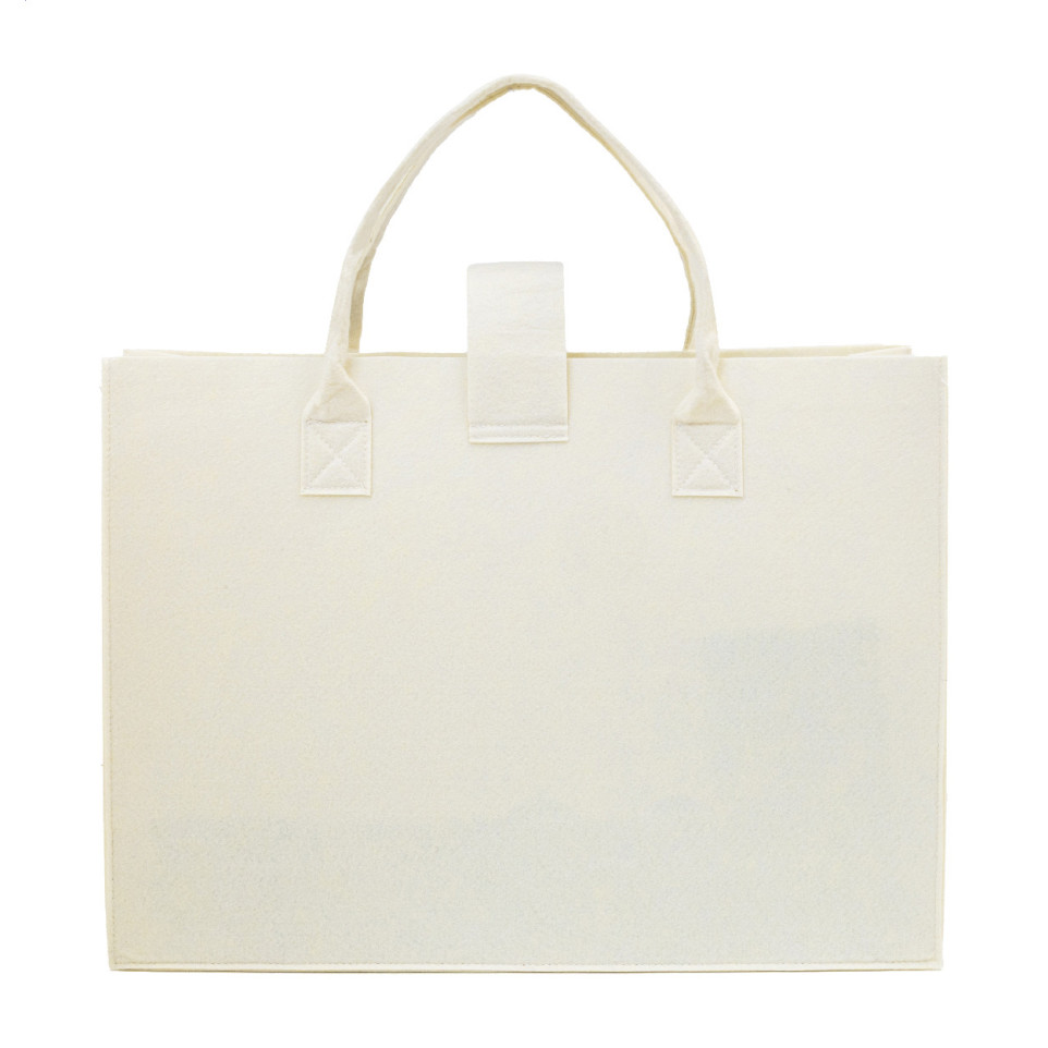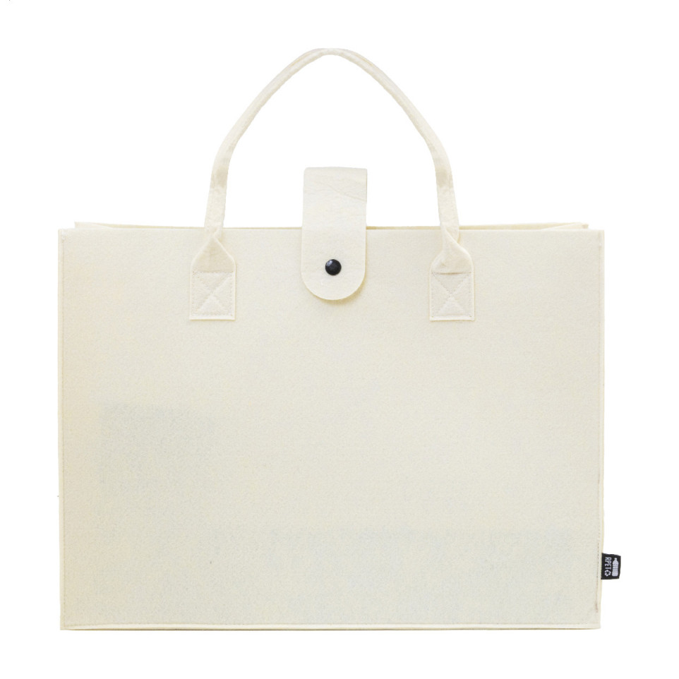 Sac shopping en feutrine RPET avec soufflet, fermeture à pression et anses courtes, idéal pour le shopping quotidien ou vos événements promotionnels. Son design naturel s’adapte à toutes les occasions.