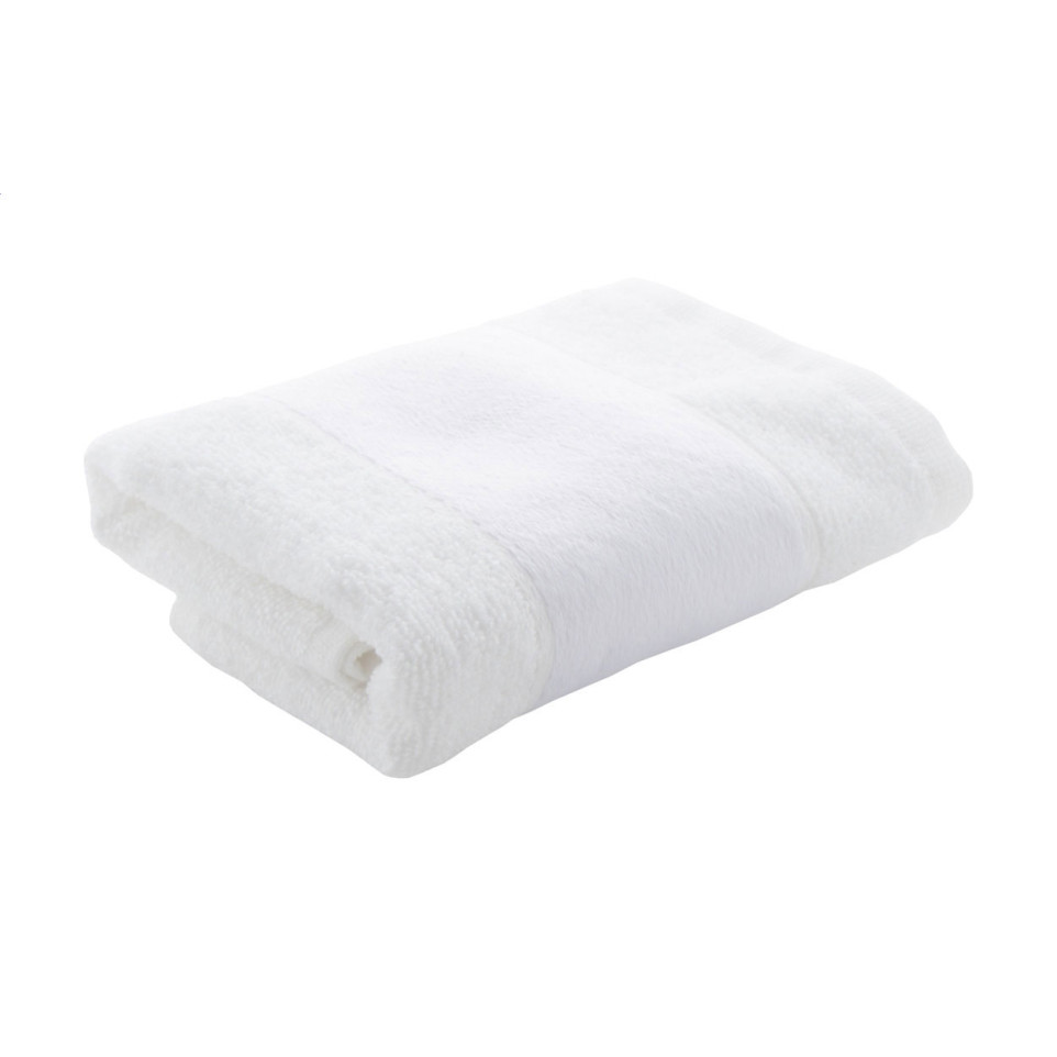 Serviette éponge blanche 100 % coton, grammage 400 g/m², idéale pour la personnalisation grâce à son large bord en polyester conçu pour l’impression en sublimation. Pratique pour les usages quotidiens, événements ou cadeaux d’affaires.