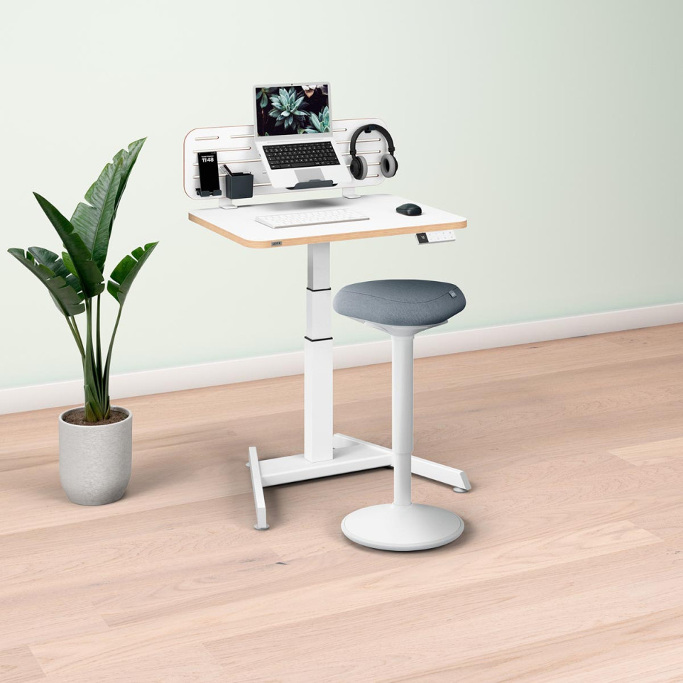La station se règle électriquement à la hauteur souhaitée via sa commande facile d’accès, permettant d’alterner entre travail assis et debout selon les besoins. L’organisateur optimise l’espace de travail, tandis que le tabouret favorise une posture active. Les ports USB facilitent la recharge des appareils, et la fonction de rappel encourage la mobilité au quotidien.