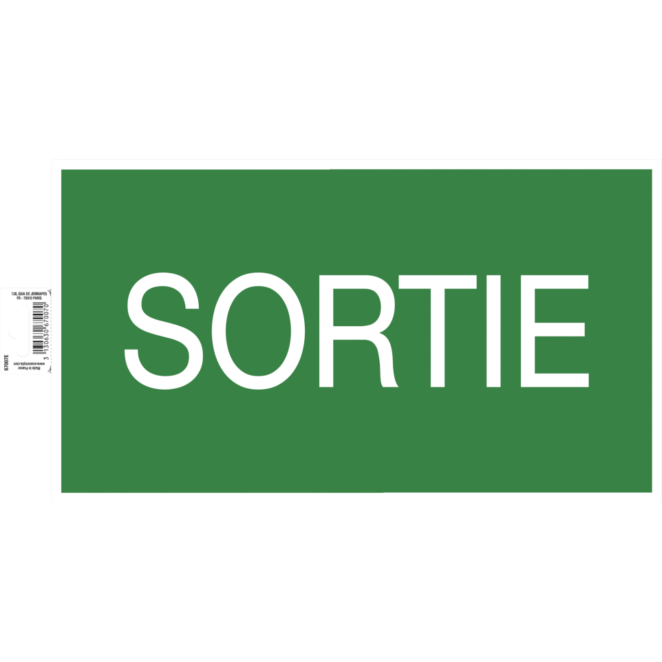 Panneau PVC adhésif antidérapant Sortie 35 cm Les dispositifs de signalisation d'évacuation et de sorties de secours sont obligatoires dans tous les établissements amenés à recevoir du public afin de permettre de gérer le plus facilement possible tout plan d'évacuation d'urgence, par exemple en cas d'incendie. Afin d'être facilement repérable, cette signalisation doit être placée de façon visible à l'intérieur de l'établissement. Ce panneau conforme aux normes ISO 7010 est également une précieuse indication pour faciliter l'intervention des secours. En PVC, coala anti dérapant, il est trés résistant grâce à son épaisseur et se positionne facilement sur les murs, les portes ou tout autre support avec son côté adhésif. Anti-dérapant, il peut également être collé au sol. Existe aussi en format 20cm (ref. 67006E). L'encre traitée anti-UV garantie une très bonne tenue dans le temps de ce panneau. Fabriqué en France