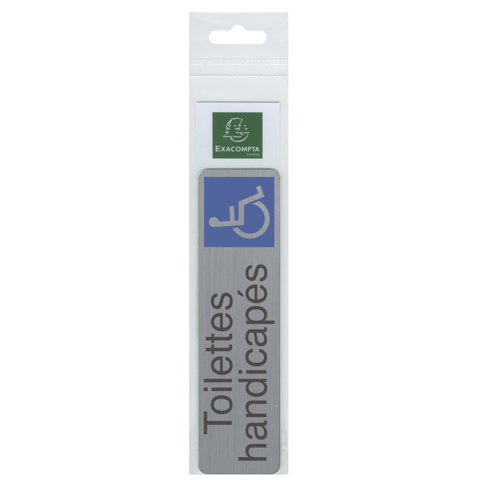 Plaque adhésive imitation aluminium Toilettes handicapés 16,5X4,4 cm Une bonne signalétique est indispensable pour informer les usagers et leur permettre de se repérer. Ce panneau permet ainsi d'orienter les usagers en balisant correctement les espaces clés. Cette plaque imprimée sur un support d'épaisseur 0,8 mm, d'aspect aluminium brossé est auto-adhésive. Elle se fixe facilement et rapidement sur tous types de supports. L'encre traitée anti-UV garantie une très bonne tenue dans le temps de ce panneau. Fabriqué en France