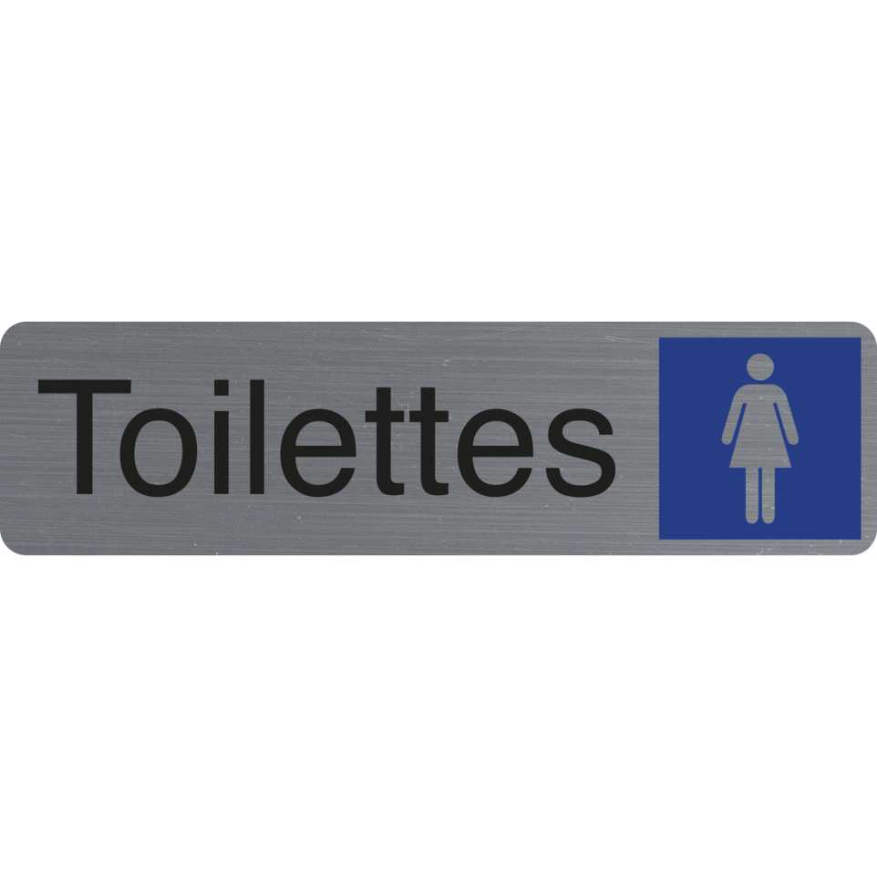 Plaque adhésive imitation aluminium Toilettes dame 16,5X4,4 cm Une bonne signalétique est indispensable pour informer les usagers et leur permettre de se repérer. Ce panneau permet ainsi d'orienter les usagers en balisant correctement les espaces clés. Cette plaque imprimée sur un support d'épaisseur 0,8 mm, d'aspect aluminium brossé est auto-adhésive. Elle se fixe facilement et rapidement sur tous types de supports. L'encre traitée anti-UV garantie une très bonne tenue dans le temps de ce panneau. Fabriqué en France
