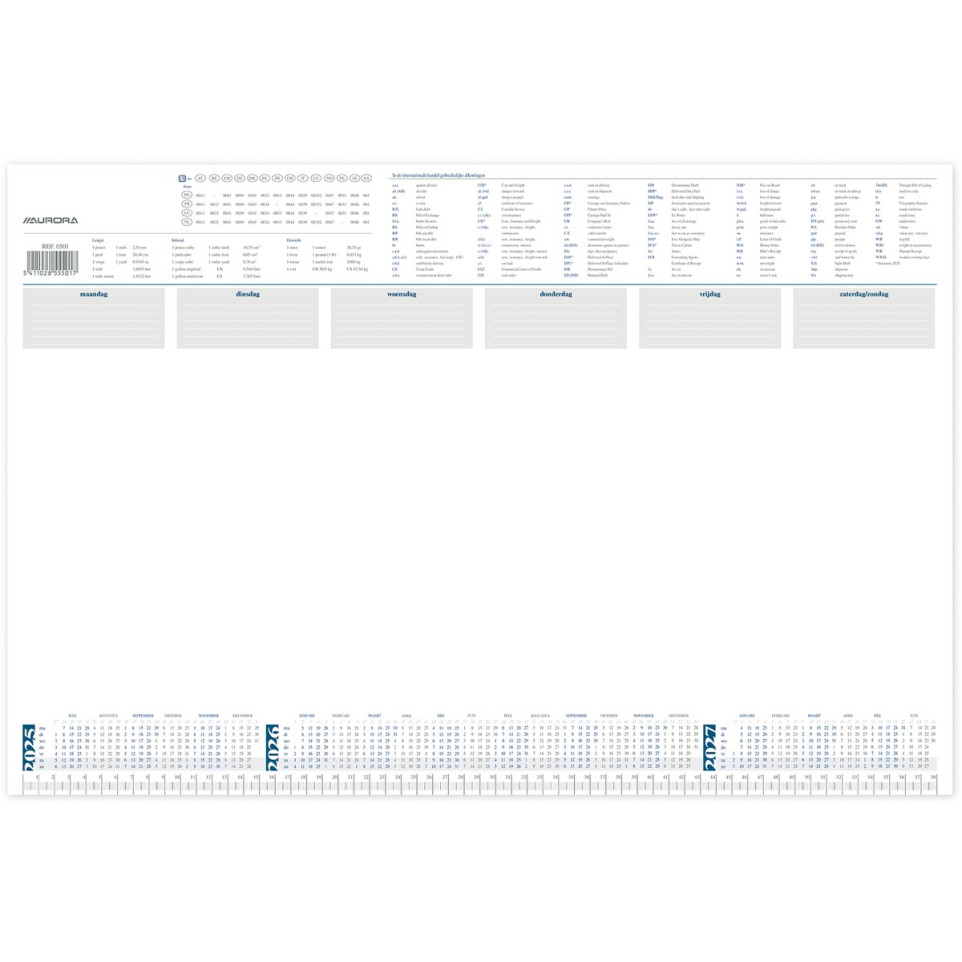 Sous-main Aurora dessous de bureau en langue néerlandaise, format 600 x 400 mm, 50 pages de papier 80 g/m². Idéal pour équiper un espace de travail et assurer une prise de notes pratique au quotidien.