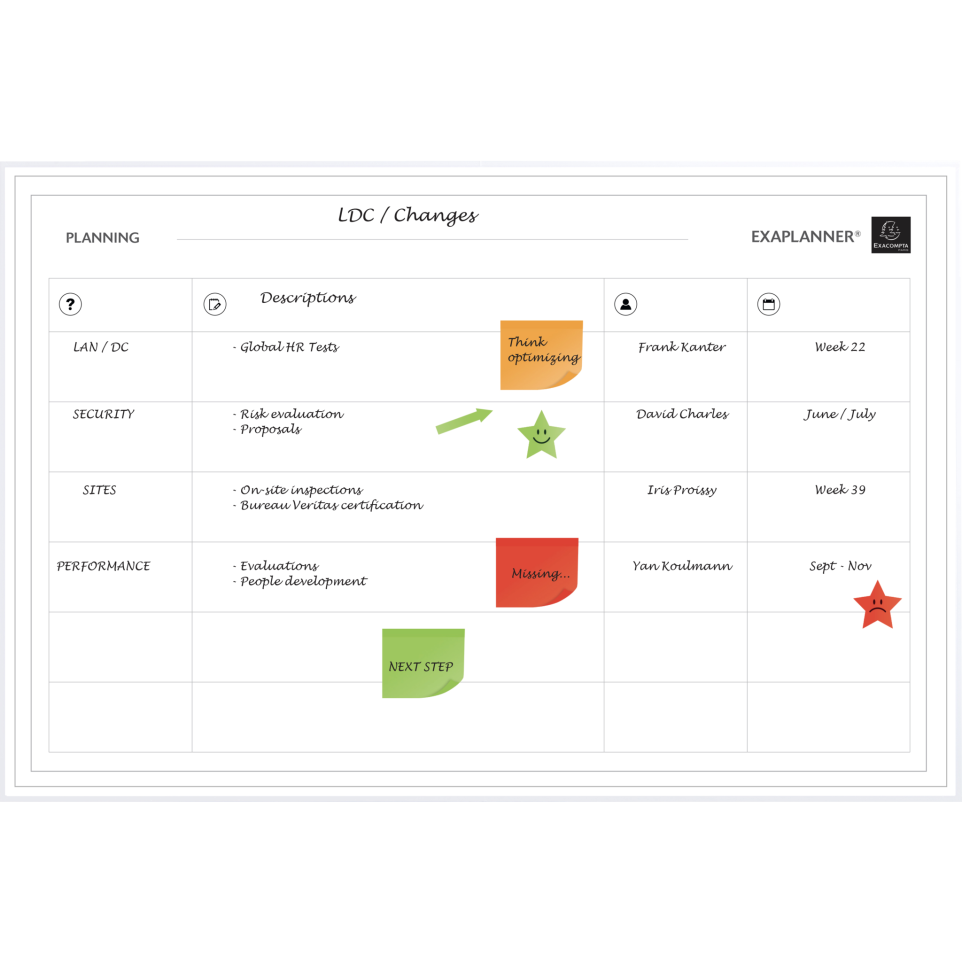 Planning magnétique Team 60x90cm Ce planning est fabriqué à partir d'un procédé innovant de papier magnétique issu des papeteries Clairefontaine. Ecologique, composé uniquement de carton et papier magnétique, il est effaçable à sec et accueille les magnets réinscriptibles livrés avec. Plus simple, beaucoup moins coûteux qu'un tableau d'affichage métal, il est facile à installer et à utiliser au quotidien, et se duplique dans tous les services. Le planificateur d'équipe permet d'organiser les missions au sein d'une équipe, d'un groupe, d'une association ... au bureau, dans un atelier ou dans un lieu semi-public. Il suffit d'identifier la tâche, d'écrire en quoi elle consiste, qui est responsable et dans quel délai. Le planificateur est livré avec des aimants conçus pour simplifier l'affichage et rendre le suivi amusant et agréable. Vous pouvez écrire sur les aimants avec le marqueur à sec et l'effaceur. Plus besoin de notes repositionnables, les aimants les remplacent. Livré avec un marqueur effaçable à sec, de nombreux aimants couleur effaçables à sec, 1 boîte de rangement pour les aimants. 1 kit de fixation murale.