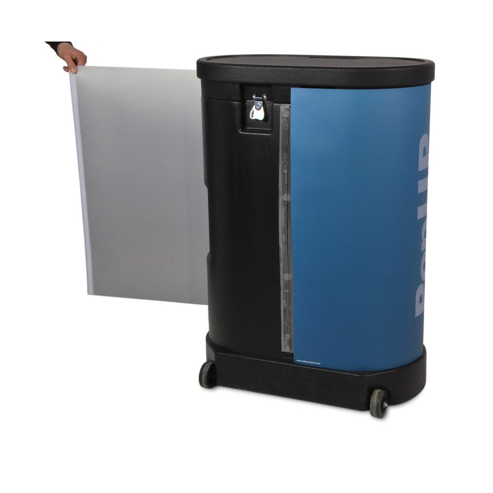 Image pour transformer la valise de votre stand parapluie en comptoir d'accueil (à complémenter par la tablette supérieure). Installation simple et rapide grâce au système magnétique.