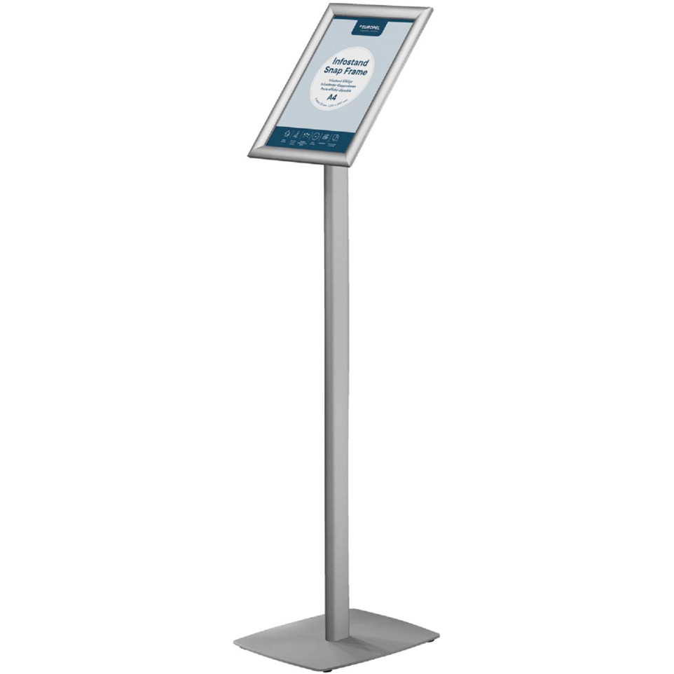 Support standard Europel pour sol, conçu pour l’affichage d’informations au format A4. Structure robuste et moderne idéale pour signaler ou informer dans les espaces professionnels, magasins ou lieux publics.