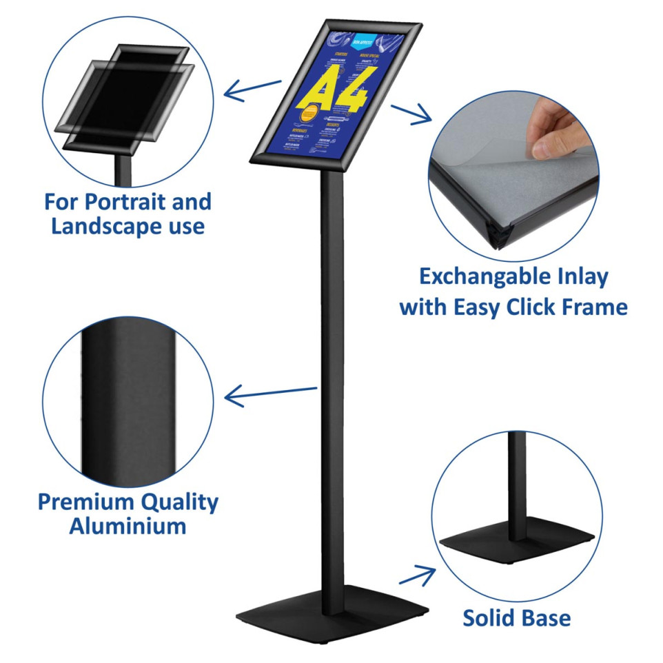 Porte-affiche au sol Europel pour format A4, conçu en métal noir, idéal pour présenter des informations dans des espaces publics, bureaux ou halls d’accueil. Sa structure robuste garantit stabilité et visibilité optimale des documents.
