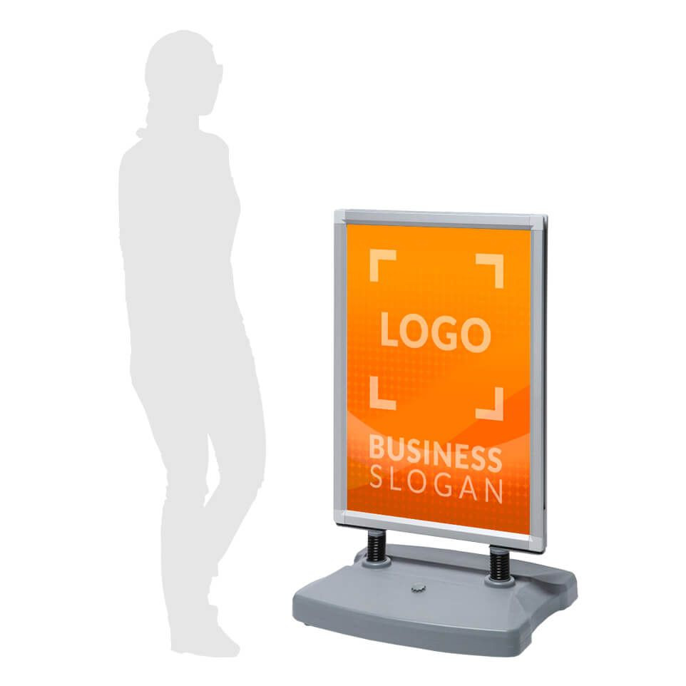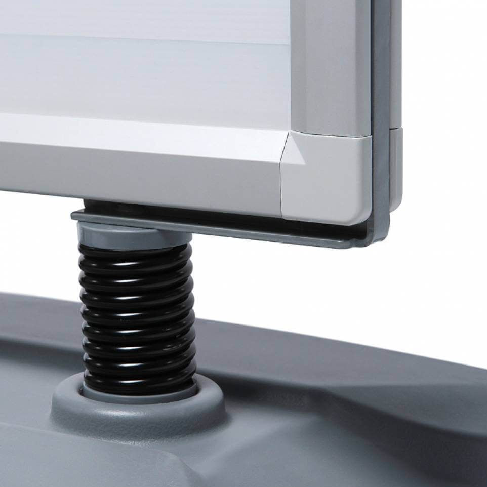 A2. Stabilité conçue pour l’extérieur : La base à remplir d’eau ou de sable et le cadre monté sur ressorts limitent les effets du vent, ce qui réduit les risques de chute et protège vos affiches lors d’un usage intensif en extérieur.