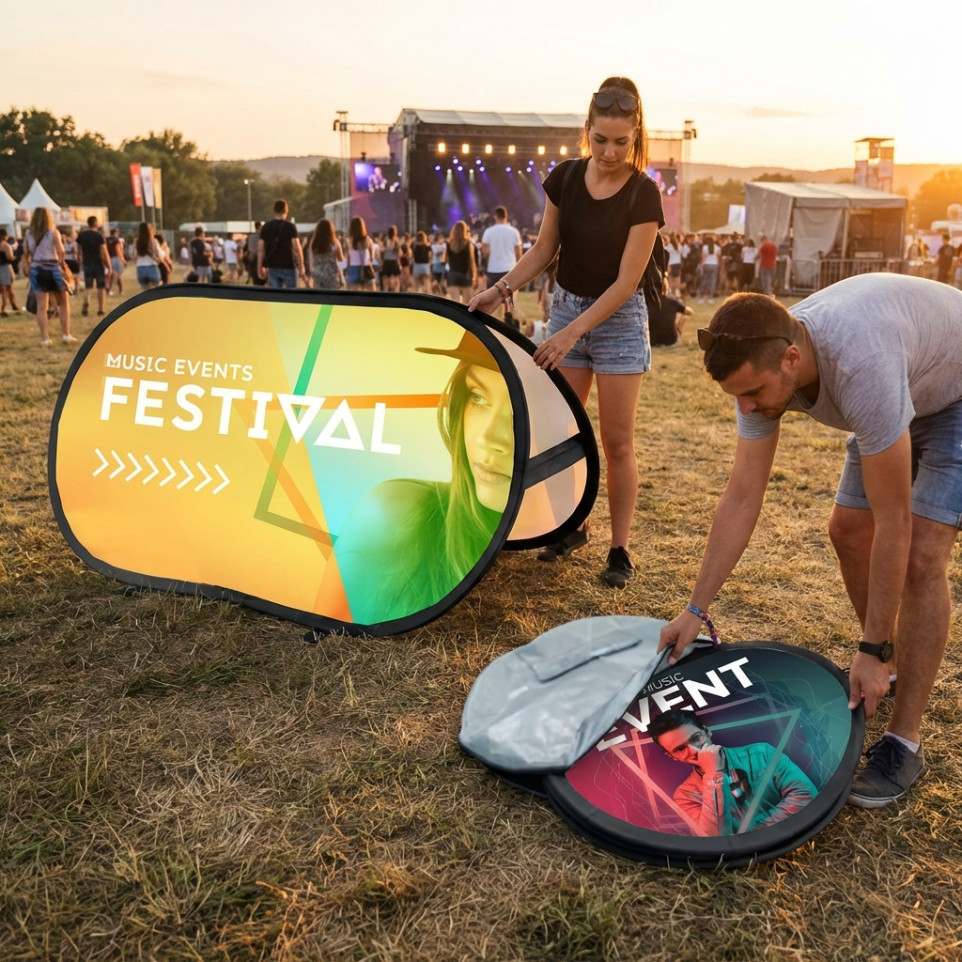 A1. Installation en quelques secondes : Le Toblerone Outbean Pop-Up se déplie automatiquement dès sa sortie de la housse circulaire, ce qui vous permet de mettre en place votre message sans outil, sans réglage et sans perte de temps sur vos événements.