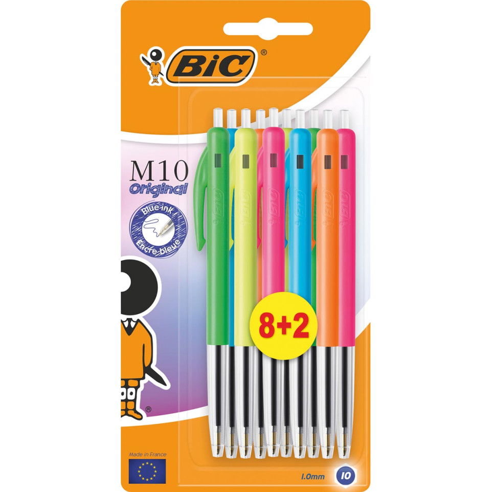 Stylo bille rétractable Bic M10 Clic Colors, fourni en lot blister 8+2 gratuit. Écriture fluide avec largeur de trait de 0,4 mm et pointe moyenne de 1 mm. Idéal pour un usage quotidien au bureau, à l'école ou à la maison.