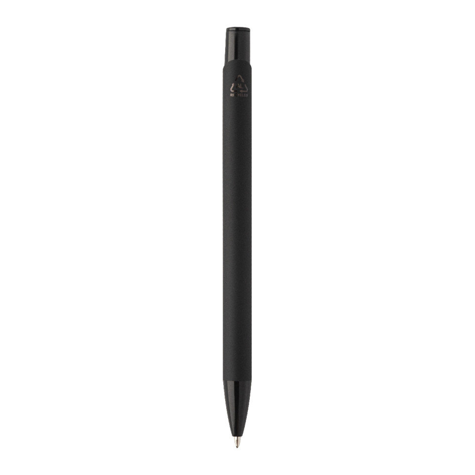 Stylo bille noir au design moderne, conçu en aluminium recyclé avec un corps caoutchouté pour une prise en main confortable. Idéal au quotidien, il apporte une touche distinctive lors du travail, des réunions ou en déplacement.