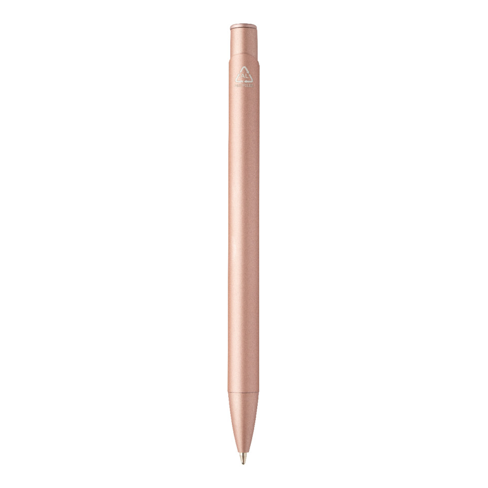Stylo à bille en aluminium recyclé, finition caoutchoutée rose avec des attributs de couleur assortie. Idéal pour l’écriture quotidienne au bureau, lors d’événements professionnels, ou comme accessoire promotionnel élégant. Encre bleue.