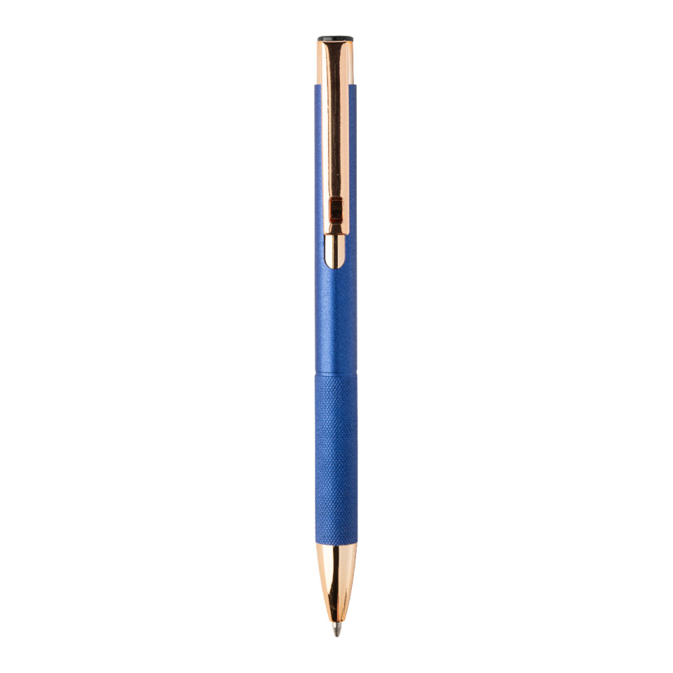 Stylo à bille Rozoros bleu avec corps fin en aluminium recyclé, finition mate, attributs en or rosé et grip texturé pour une prise en main confortable. À usage quotidien pour l’écriture professionnelle ou personnelle.