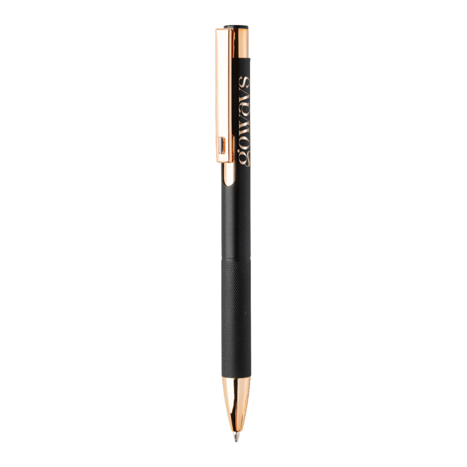 Stylo à bille en aluminium recyclé, finition mate noire, équipé d’un grip texturé pour une prise en main confortable et d’attributs élégants en or rosé. Idéal pour un usage professionnel ou comme accessoire raffiné au quotidien. Encre bleue.