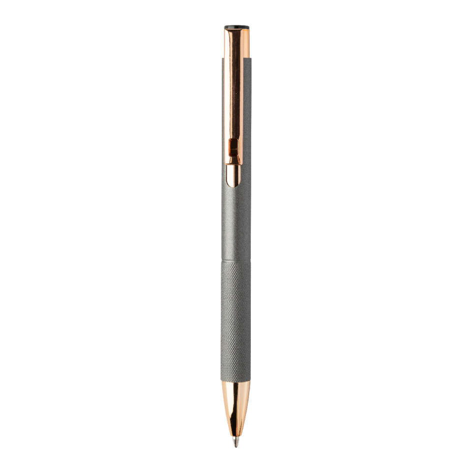 Stylo à bille Rozoros gris clair au design contemporain, idéal pour un usage quotidien en contextes professionnels ou personnels. Sa finition élégante et son grip texturé offrent confort d’écriture et raffinement.