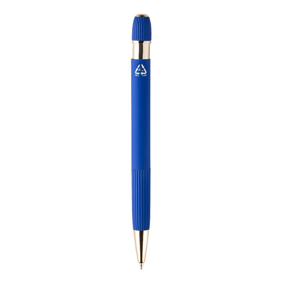Stylo à bille tactile Rozubi bleu, conçu en aluminium recyclé, doté d’un corps caoutchouté avec attributs or rosé, idéal pour une écriture fluide et l’utilisation sur écrans tactiles en contexte professionnel ou événementiel.