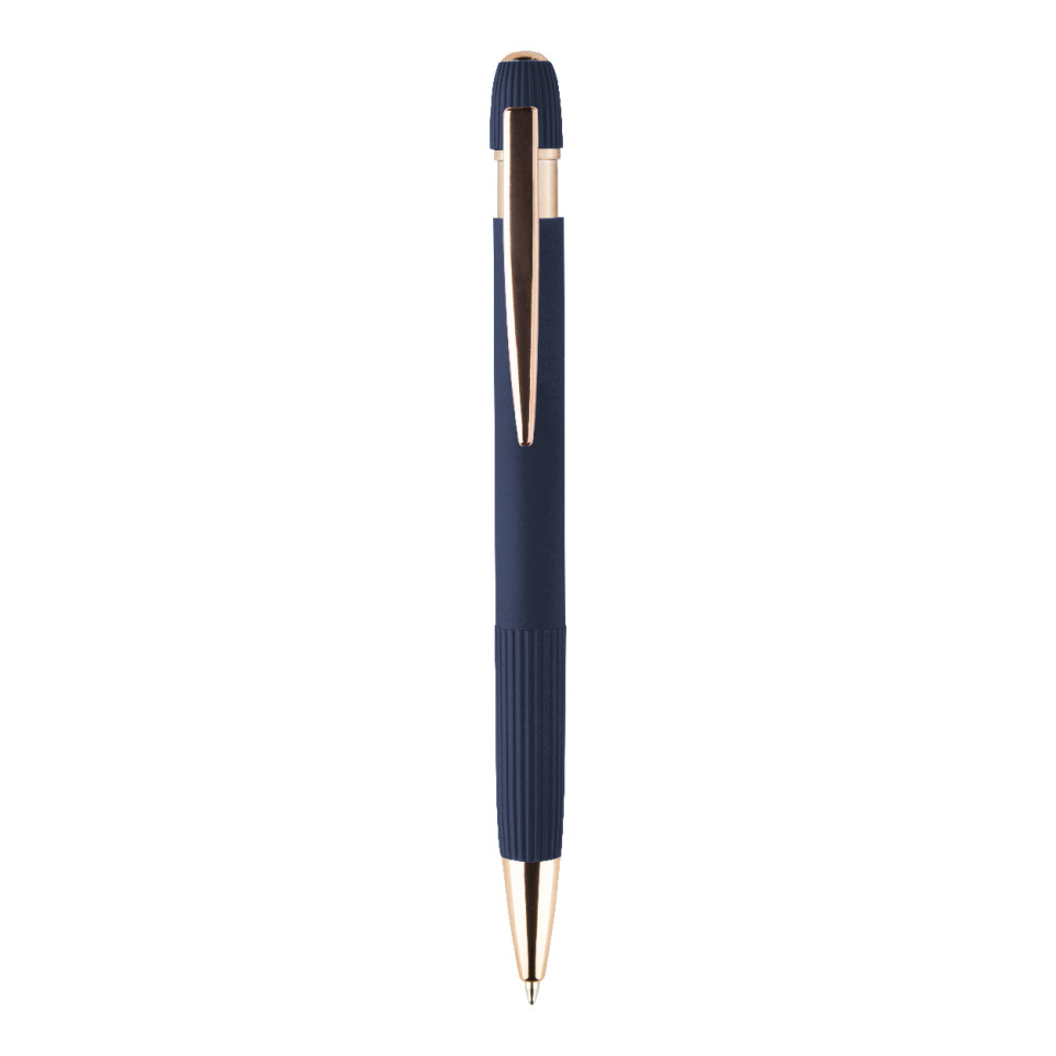 Stylo à bille tactile bleu foncé, conçu en aluminium recyclé, doté d’un corps caoutchouté pour une prise en main confortable. Idéal pour une utilisation quotidienne au bureau ou en déplacement.