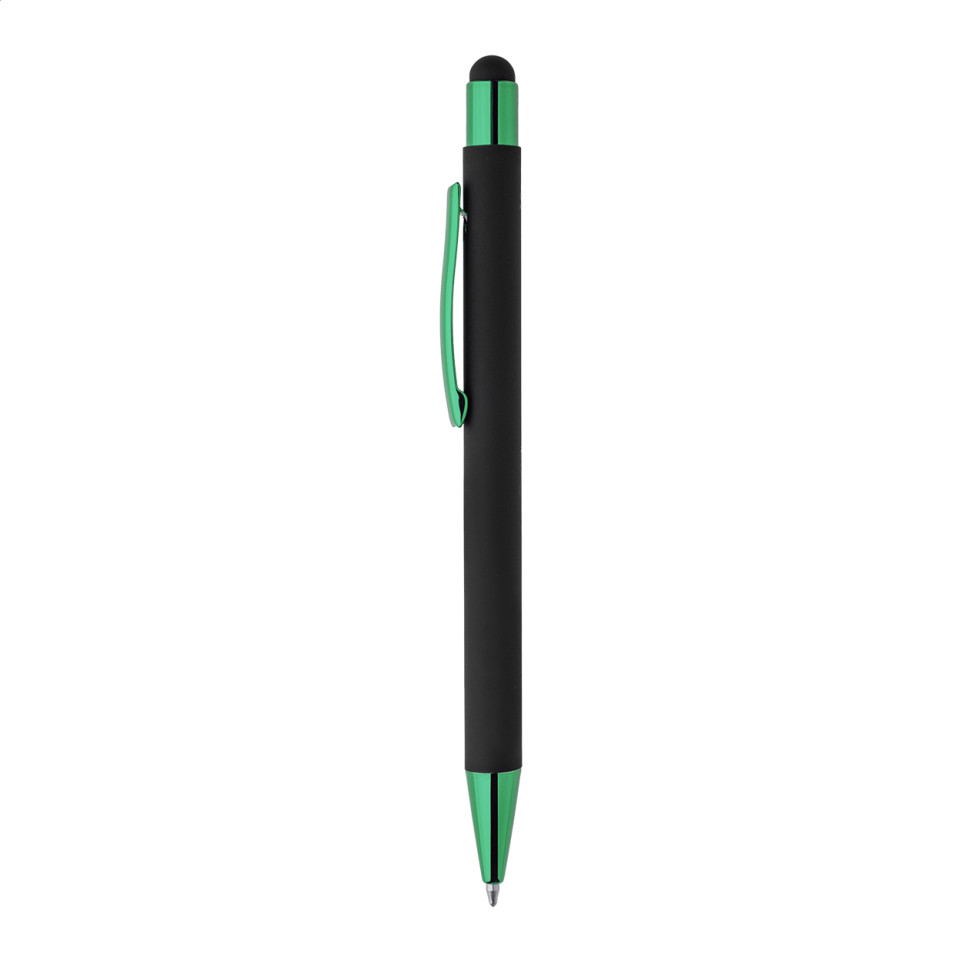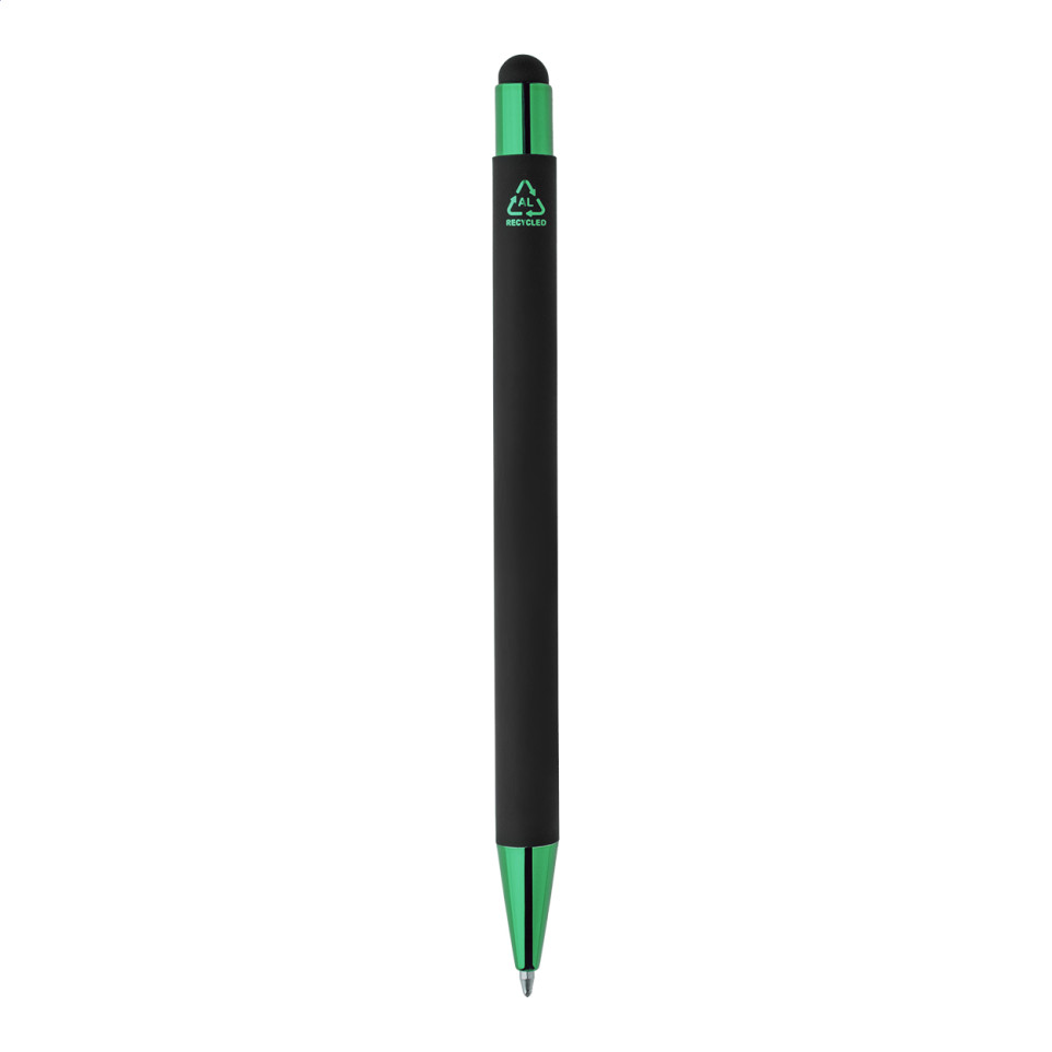 Stylo à bille et stylet tactile Darkly Tap vert en aluminium recyclé, doté d’un corps caoutchouté noir et de parties métalliques brillantes vertes. Idéal pour notes précises et navigation tactile sur écrans.