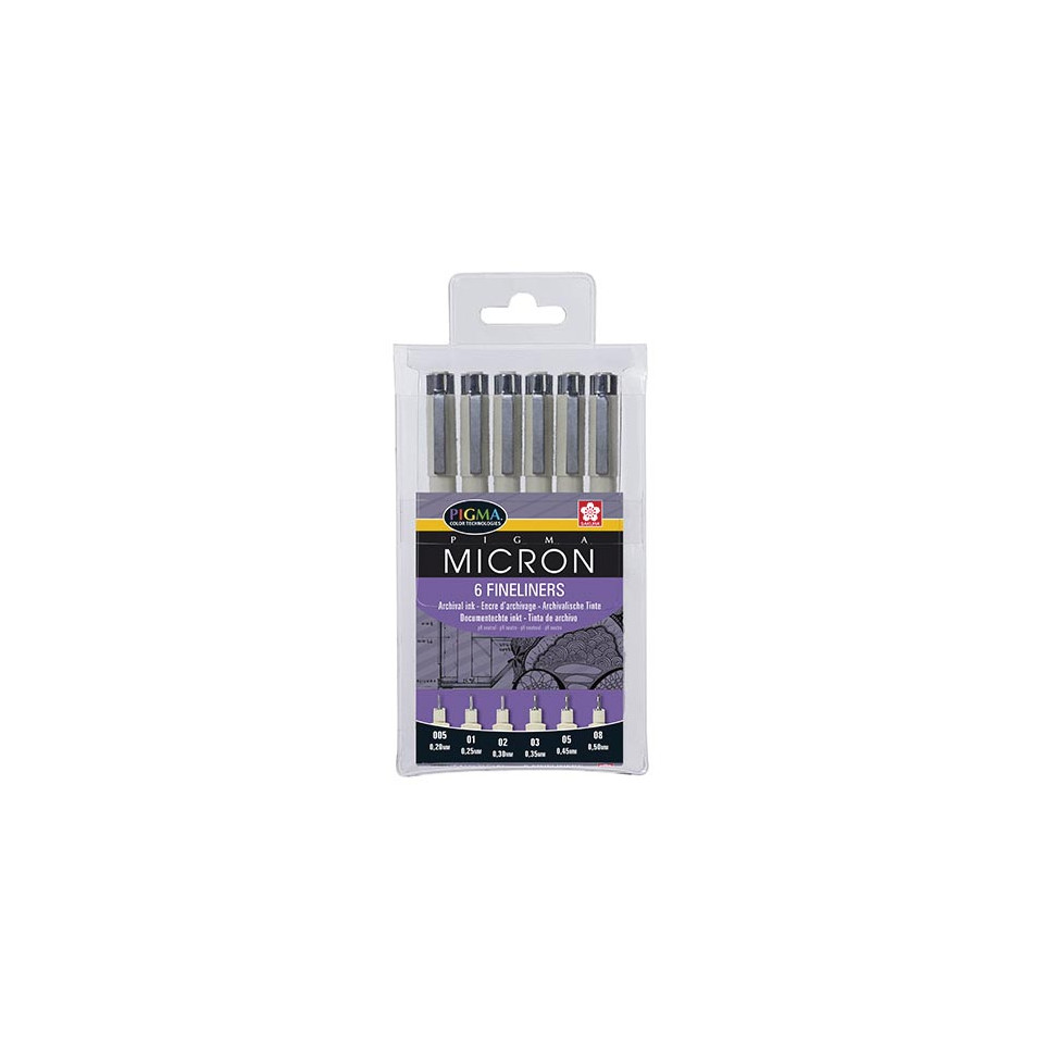 Le Sakura feutre fin Pigma Micron, noir, est un ensemble de 6 feutres à dessin calibrés, parfaits pour les dessins techniques, esquisses ou créations artistiques précises sur papier, bois, tissu, porcelaine ou carton.