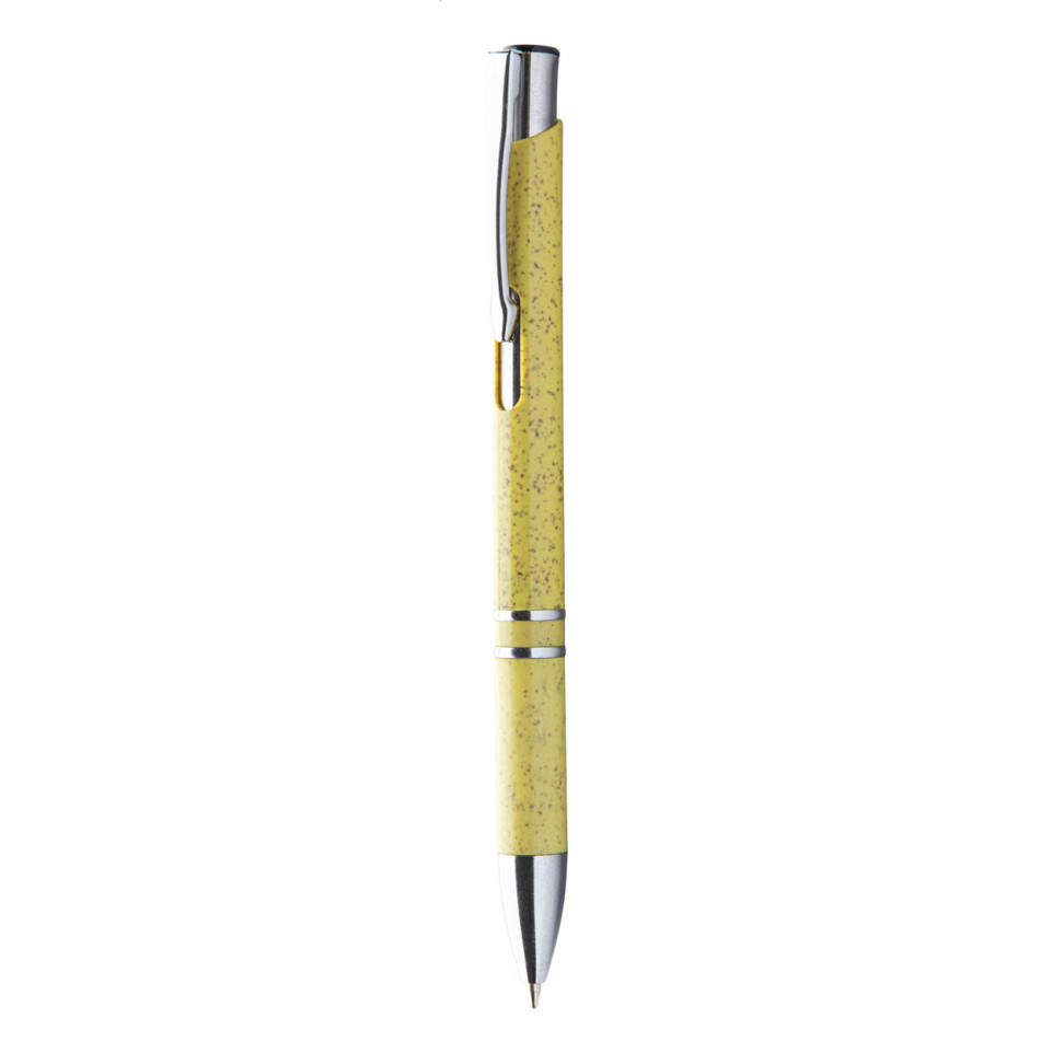 Le Wennel jaune est un stylo à bille écologique fabriqué en paille de blé et plastique avec des pièces métalliques. Doté d'une encre bleue, il allie fonctionnalité et respect de l'environnement pour vos besoins d'écriture quotidiens.