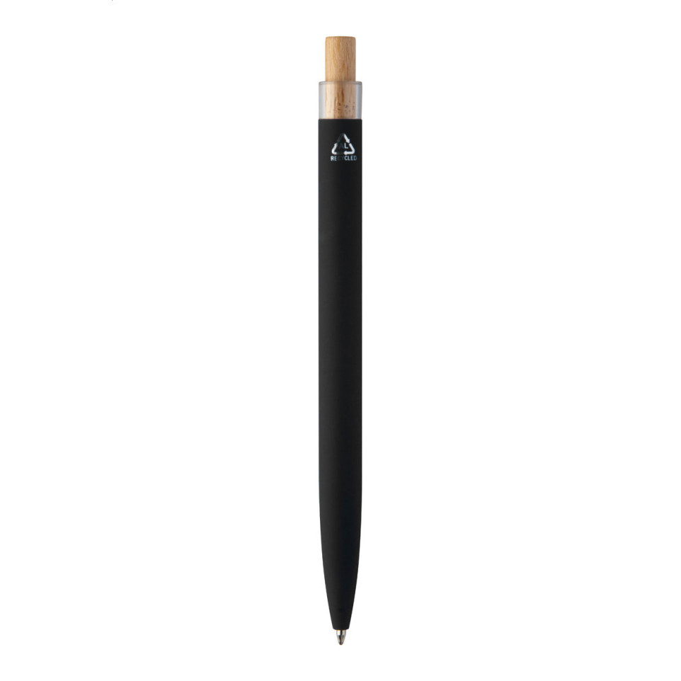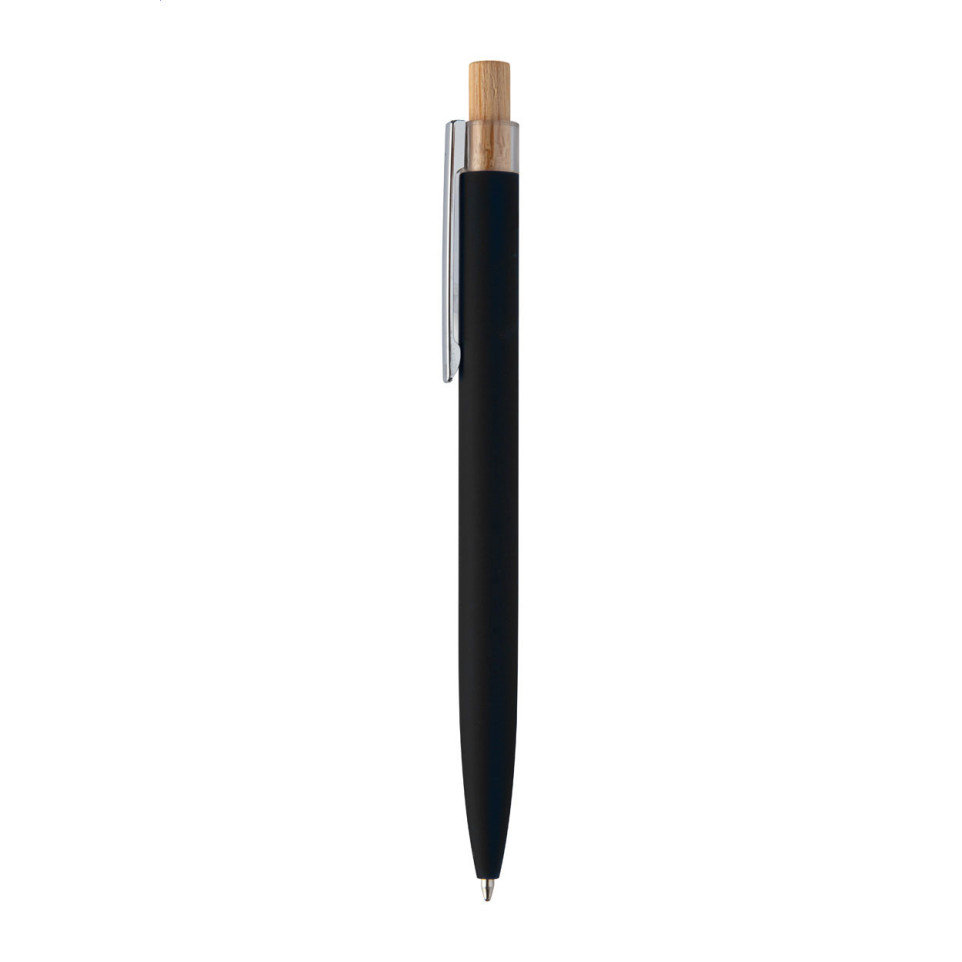 Stylo à bille éco-conçu en aluminium recyclé, finition noire caoutchoutée, doté d’un bouton pression en bambou naturel et d’un clip chromé. Idéal pour un usage quotidien au bureau, lors de réunions ou en déplacement.
