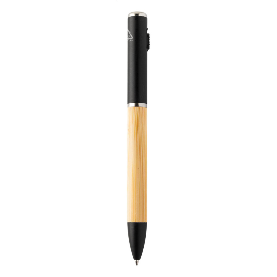 Stylo à bille rotatif Penboo noir, conçu en bambou et plastique ABS recyclé, équipé d’une lampe LED intégrée pour une utilisation pratique en toutes circonstances. Idéal pour le bureau, la maison ou en déplacement.