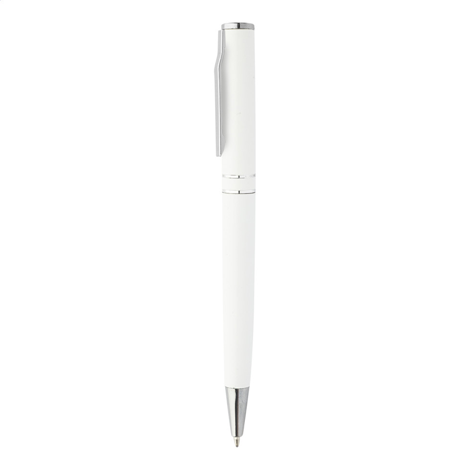 Le Rimma blanc est un stylo à bille à mécanisme rotatif, fabriqué en aluminium recyclé avec des attributs chromés. Il est présenté dans un élégant coffret cadeau noir, idéal pour offrir en contexte professionnel.