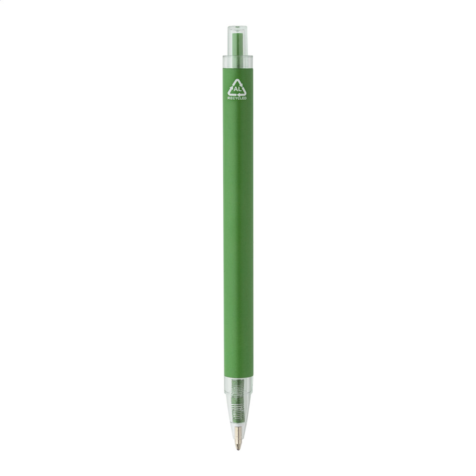 Stylo à bille PeekThru vert en aluminium recyclé, avec corps à finition mate et attributs transparents en RPET. Équipé d'encre bleue, il convient pour une écriture quotidienne en contexte professionnel ou promotionnel.