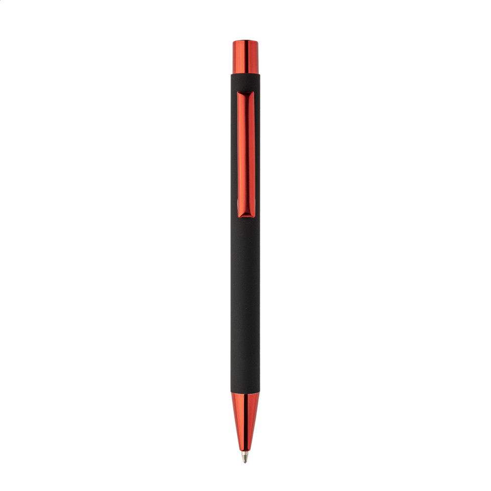Stylo bille Darkly rouge en aluminium recyclé, avec corps caoutchouté noir et parties métalliques brillantes colorées en rouge. Équipé d'une encre bleue, il convient pour une écriture quotidienne en entreprise ou en promotion.