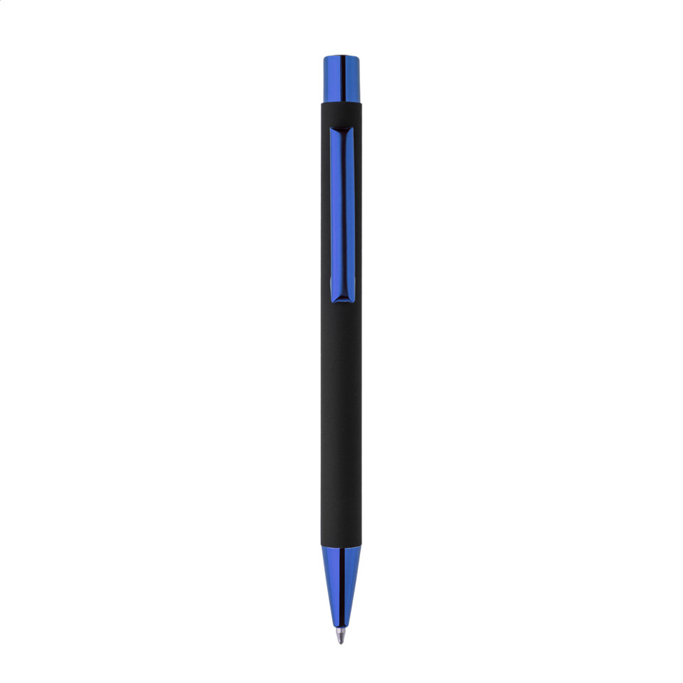 Stylo bille Darkly bleu en aluminium recyclé, au corps caoutchouté noir et parties métalliques brillantes en bleu. Idéal pour une écriture fluide au quotidien ou en contexte professionnel.