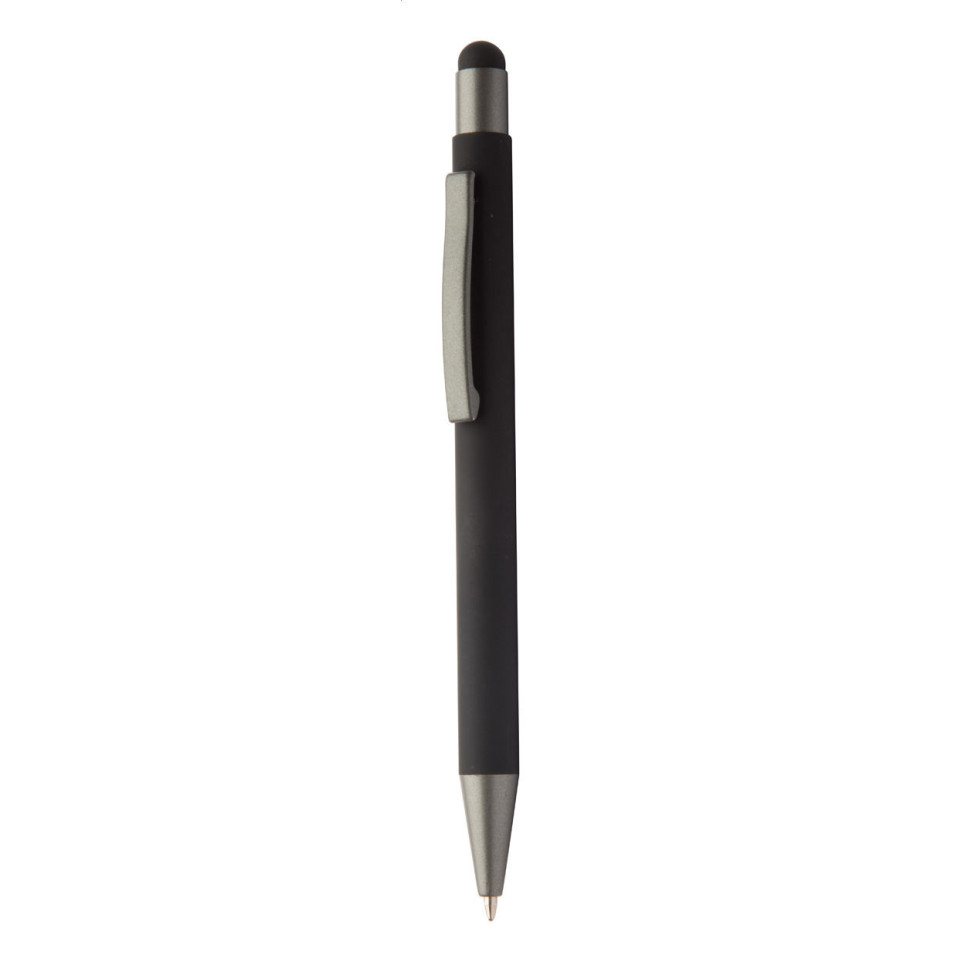 Stylo à bille stylet avec finition en caoutchouc, combinant fonctionnalité d'écriture et navigation tactile sur écrans. Son encre bleue garantit une écriture fluide pour un usage quotidien professionnel.
