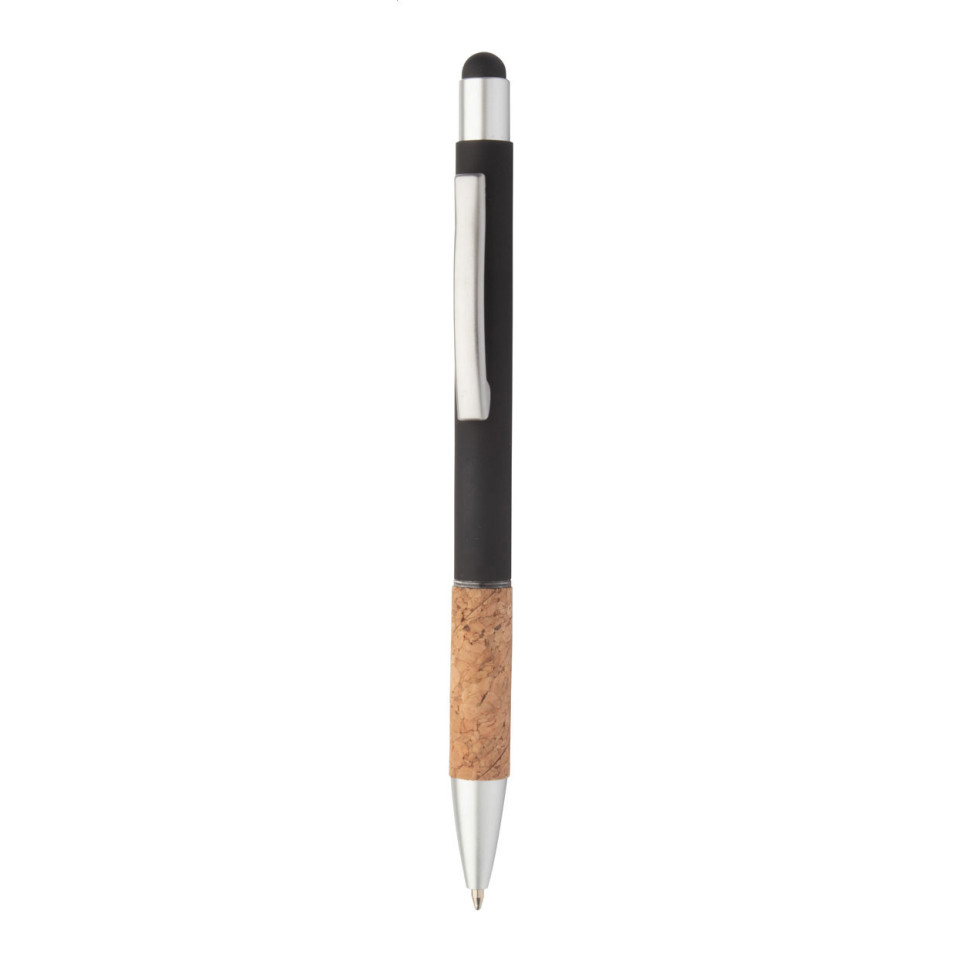 Stylo à bille stylet Corbox noir en aluminium, équipé d’une embase en liège naturel et d’un corps finition mat. Polyvalent, il s’utilise à la fois comme stylo à bille (encre bleue) et comme stylet pour écrans tactiles.