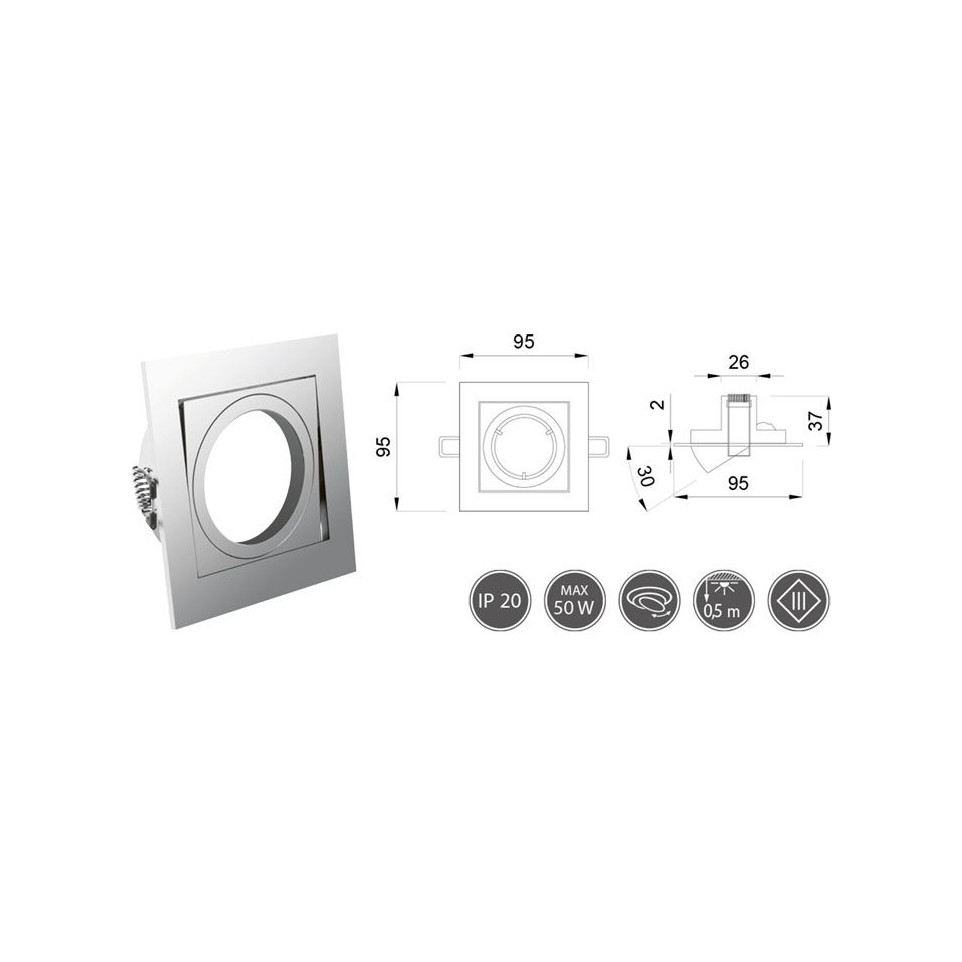 Support Vila carré orientable chrome conçu pour l'installation de spots LED. Idéal pour les plafonds nécessitant un éclairage directionnel, il s'intègre facilement dans tous types d'environnements résidentiels ou professionnels.