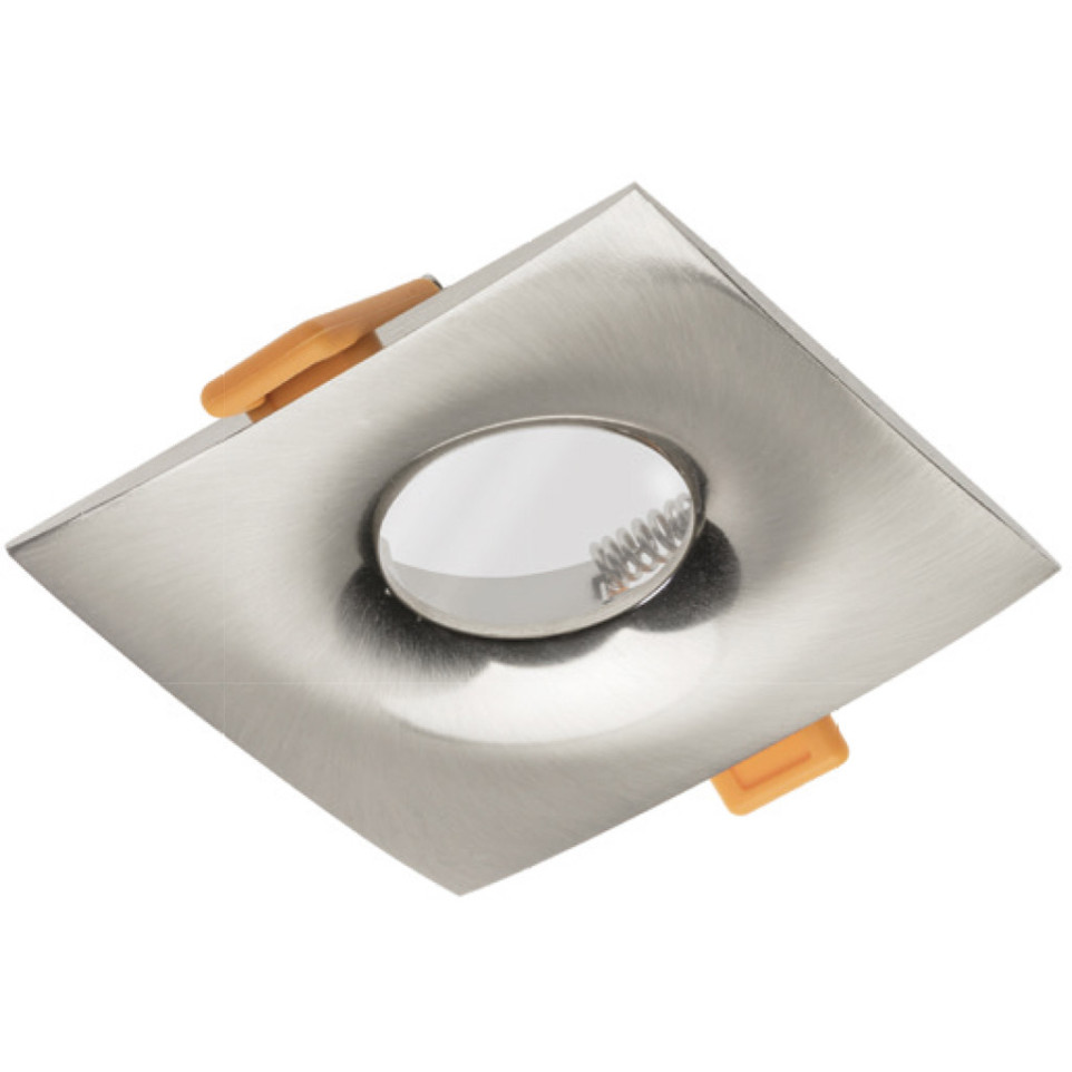 Support Alessio carré inox look conçu pour l’intégration de spots LED de 50 mm, idéal pour l’éclairage en zones humides telles que salles de bain ou cuisines. S’installe discrètement dans le plafond pour un rendu soigné.