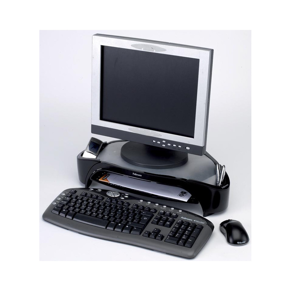 Support pour moniteur Fellowes Plus Smart Suites, conçu pour optimiser l’ergonomie au poste de travail. Idéal pour élever un écran plat jusqu’à 21 pouces tout en offrant un espace de rangement intégré adapté aux bureaux à surface limitée.