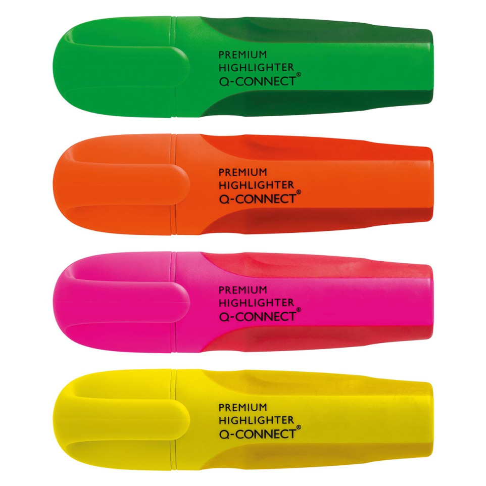 Q-CONNECT Premium surligneur est un lot de 4 surligneurs à encre fluorescente, conçu pour mettre en évidence efficacement les informations sur tous types de documents. Chaque surligneur possède une pointe biseautée adaptée au marquage précis et large.